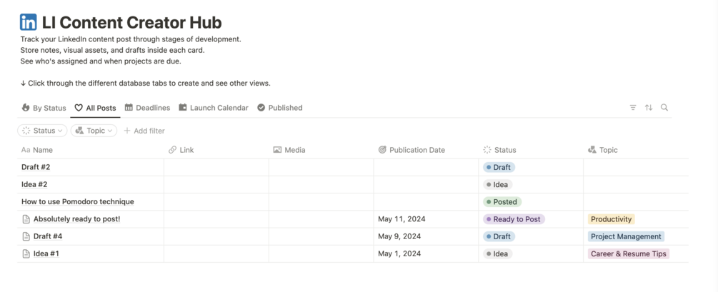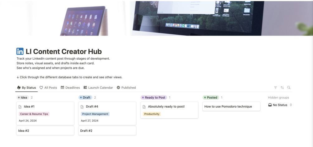 If you are a content creator who puts your ideas in notes on the phone, tracks the content calendar in a spreadsheet or PPT, every time lose ideas, drafts, or looking for posted content on Linkedin - THIS Notion Workspace is designed for you.